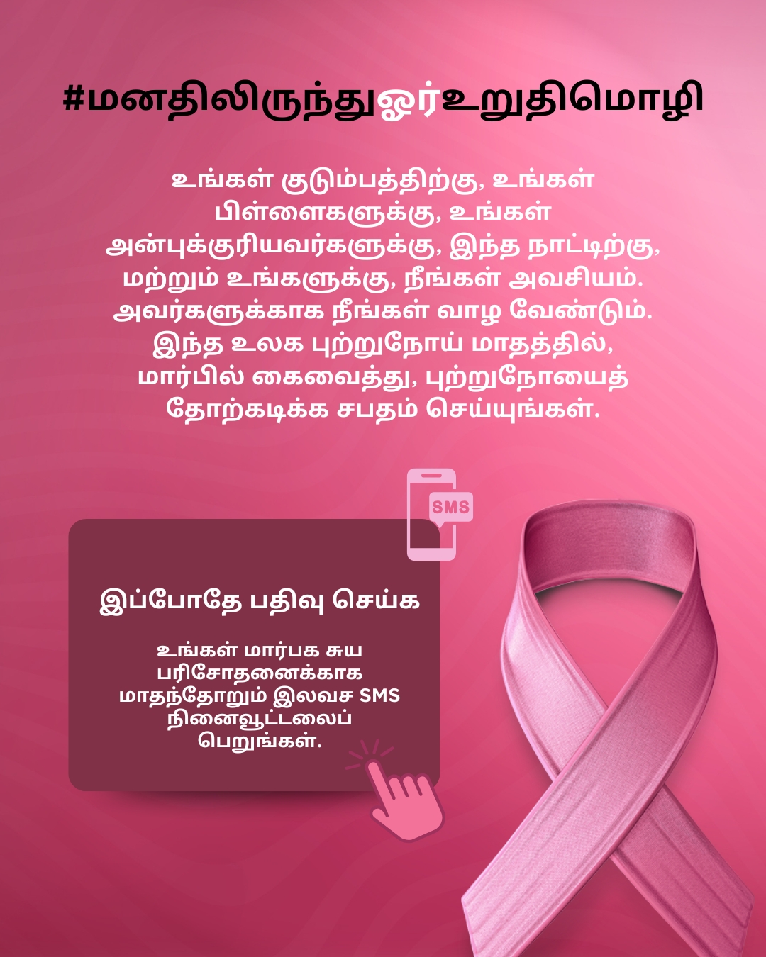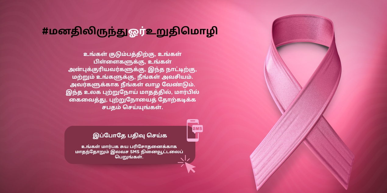 நீங்கள் நினைவில் வைத்துக்கொள்வதை நாங்கள் இலகுவாக்கி உள்ளோம். எமது இலவச SMS நினைவூட்டல் சேவைக்காகப் பதிவு செய்யுங்கள். அதன் மூலம், உங்கள் மார்பக சுய பரிசோதனையை மேற்கொள்ள நினைவூட்டும் எளிய செய்தி ஒன்றை ஒவ்வொரு மாதமும் நீங்கள் பெறுவீர்கள்.
